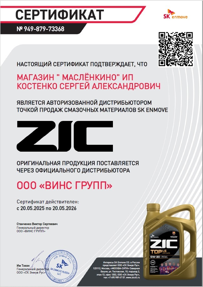 Магазин масел и автохимии «Маслёнкино» ИП Костенко Сергей Александрович является авторизованным дистрибьютором точкой продаж смазочных материалов SK ENMOVE ZIC оригинальная продукция поставляется через официального дистрибьютора ООО «ВИНС ГРУПП» Сертификат действителен: с 20.05.2025 по 20.05.2026